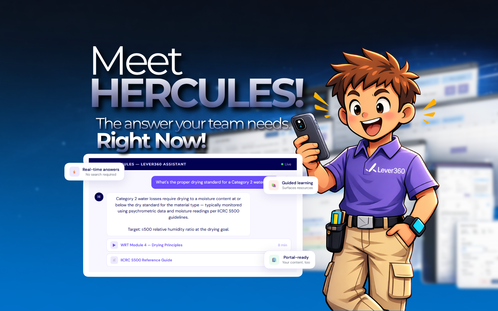 Hercules is Lever360's new real-time knowledge assistant, built directly into the learning side of the platform. It gives restoration professionals fast, credible answers in the moment — and then takes it one step further by connecting them to the training content, videos, and resources that help them keep growing.